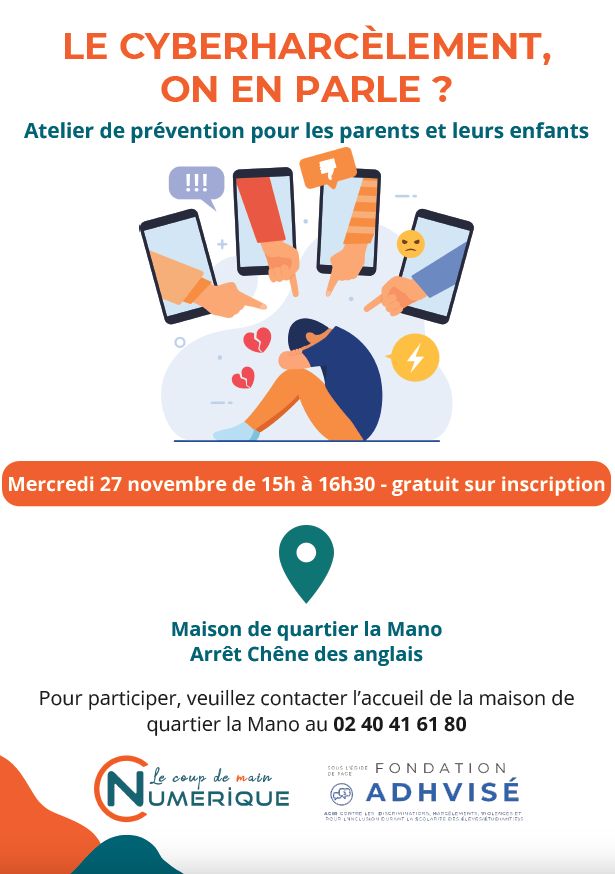 Pour lutter contre ce problème, l’association Le Coup de Main Numérique et la Fondation ADHVISÉ vont mener un atelier de prévention sur la thématique du cyberharcèlement. Il est destiné en premier lieu aux parents et à leurs enfants, mais aussi aux professionnels travaillant avec un jeune public, ou même aux personnes voulant s’informer sur le sujet.